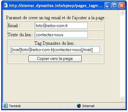 L'insertion des liens : Lien vers une page de votre site : Utiliser le bouton de la barre d'outils. Une fenêtre propose la liste des pages cibles. Chaque page propose deux actions : "direct" ou "param". DIRECT insère directement le dynatag de la page cible. PARAM propose de paramètrer le dynatag.