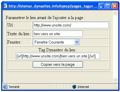 Lien vers une page d'un autre site : Utiliser le bouton de la barre d'outils. La fenêtre suivante est ouverte :