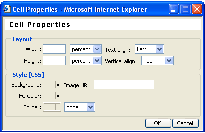 Alignment : spécifie l'alignement du tableau. Noset = pas de spécification ; Left = alignement à gauche ; Right = alignement à droite ; Texttop = alignement au sommet du texte ; Absmiddle = ? ; Baseline = ? ; Absbottom = ? ; Bottom = ? ; Middle = ? ; Top = ?.