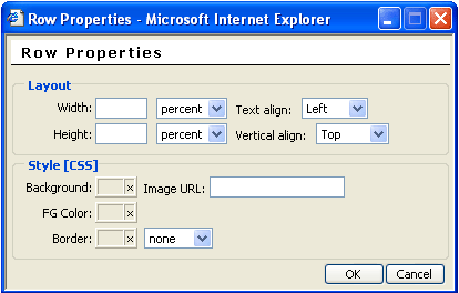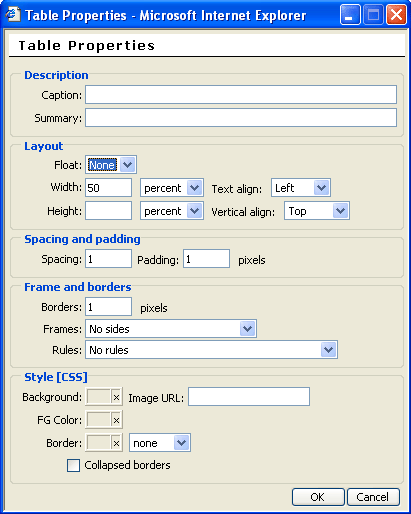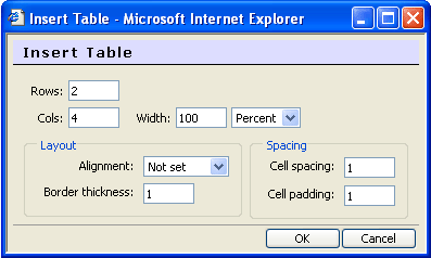 Alignment : spécifie l'alignement du tableau. Noset = pas de spécification ; Left = alignement à gauche ; Right = alignement à droite ; Texttop = alignement au sommet du texte ; Absmiddle = ? ; Baseline = ? ; Absbottom = ? ; Bottom = ? ; Middle = ? ; Top = ?.